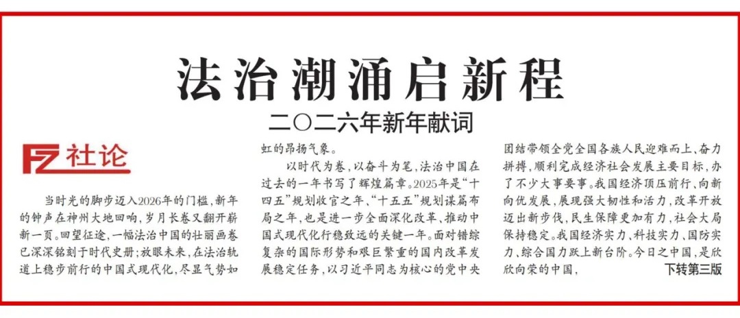 当时光的脚步迈入2026年的门槛,新年的钟声在神州大地回响,岁月长卷又翻开崭新一页。回望征途,一幅法治中国的壮丽画卷已深深铭刻于时代史册;放眼未来,在法治轨道上稳步前行的中国式现代化,尽显气势如虹的昂扬气象。